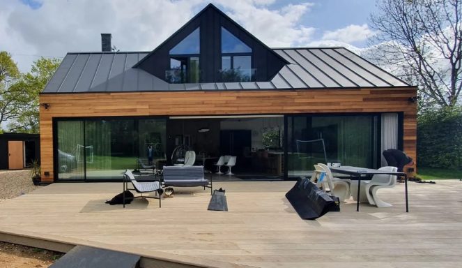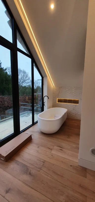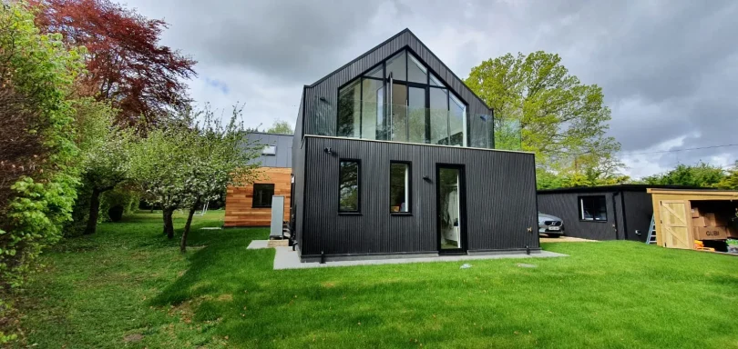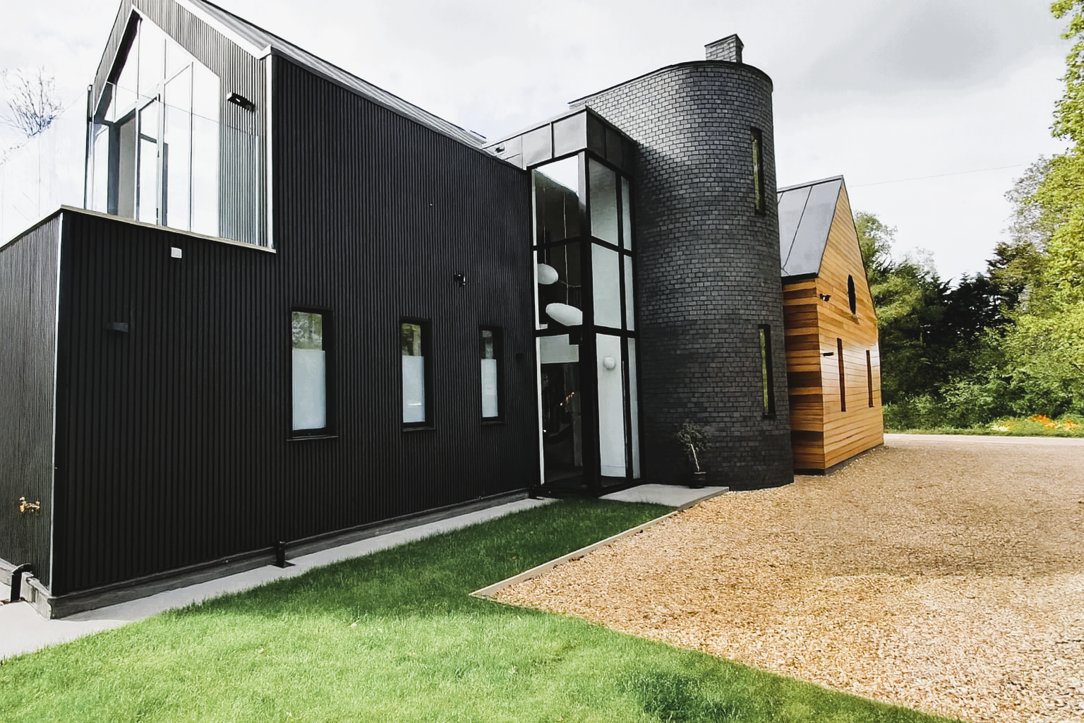 Monteagle Construction delivered this striking contemporary home, building every element from the ground up, including the distinctive turret and bespoke cladding. The project showcases a bold mix of materials, with black brick, vertical timber, and sleek glass creating a powerful architectural statement. Every detail was executed with precision, from the curved masonry to the expansive glazed entrance, resulting in a unique property that blends modern innovation with exceptional quality.